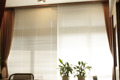 奥にブラインド、手前にオーダーカーテンをお取付いたしました。